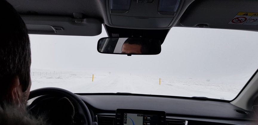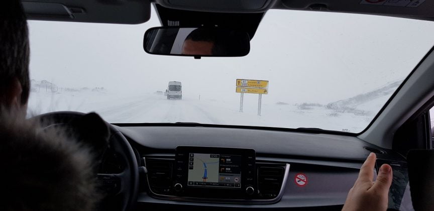 Până la hotelul unde eram cazați aveam de parcurs un drum de 60 de kilometri. Puțini, dacă ne gândim la un drum normal, mult mai mulți în condițiile unui drum acoperit de zăpadă, pe care se circula cu 20 km/oră. Și, colac peste pupăză, a început din nou viscolul.