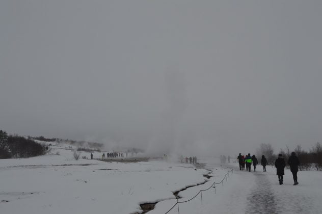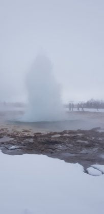 De la Kerid ne-am îndreptat spre celebrul Geysir, geiserul care aruncă apă sulfuroasă în sus, la o înălțime considerabilă și oferă un adevărat spectacol turiștilor care se strâng de jur împrejurul lui pregătiți cu aparate pentru imortalizarea momentului. Unii reușesc din prima, alții nu. Și atunci iau așteptarea de la capăt cu scopul de a obține fotografia perfectă.